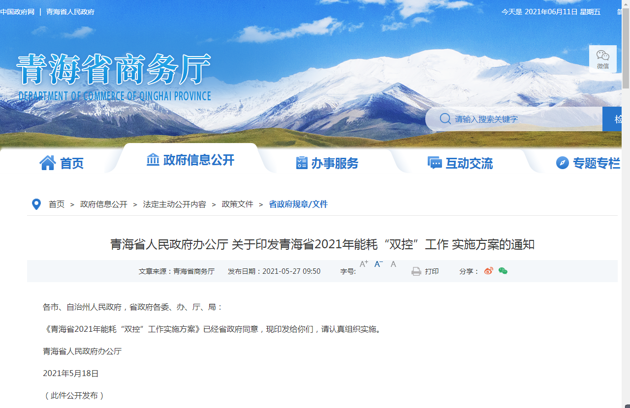 青海省人民政府办公厅 关于印发青海省2021年能耗“双控”工作 实施方案的通知