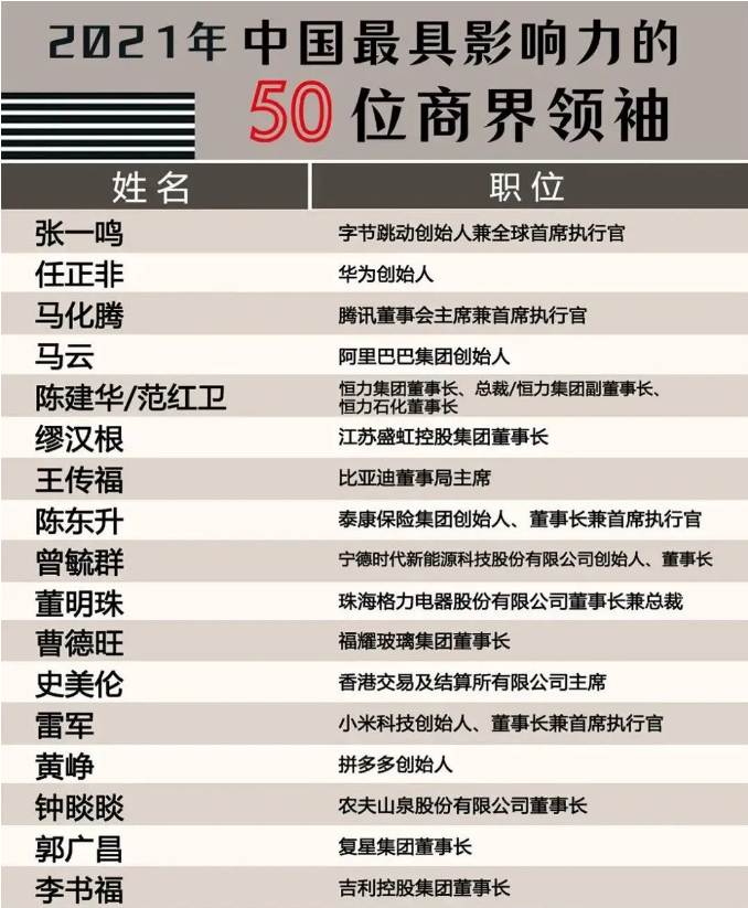 钢铁行业,中国日照钢铁杜双华、嘉晨孙寿宽、沙钢沈文荣、建龙张志祥、青山控股项光达、永兴特钢高兴江、敬业李赶坡等多位钢铁行业企业家上榜。 |