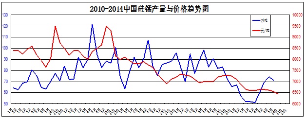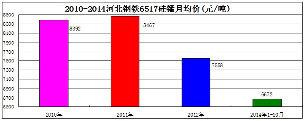 自2011年的南方电荒导致广西、湖南、贵州等地的锰合金产量剧减以后,以内蒙、宁夏为代表的北方硅锰产业携电力丰富与电价便宜等相对优势异军突起,不仅《电荒促进硅锰产业南北平衡》,还加剧了供需失衡。2014年1-10月的河北钢铁采购6517月均价格6672元/吨比2011全球月均价8467元/吨低1795元/吨。