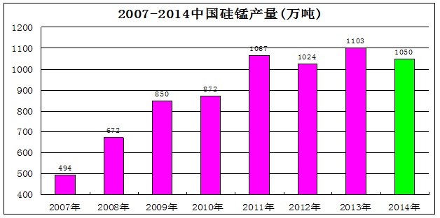 中国的锰合金市场由于关税阻隔,总体上处于进不来、出不去的封闭状态。虽然电解锰的出口关税已被取消,似乎也并未完全堵上走私漏洞。对比2011、2012、2013、2014年的硅锰等锰系合金的产量数据,大体上保持一致。如果剔除统计误差,真实产量应该相差无几,总体保持在1000-1100万吨左右的区间。