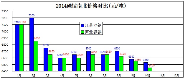 北方各地不断新增的先进大型冶炼炉,不仅彻底扭转了锰合金产业南多北少导致南铁北运的产业局面,而且彻底改变了锰合金价格北高南低的市场格局,甚至迫使北方生产的锰合金把销售区域一再向更南方向推进。2014年1-10月,沙钢6517月均采购价格6746元/吨比河北钢铁高出74元/吨。