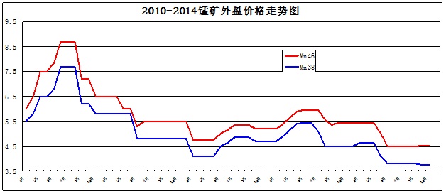 2012年以来,很难从媒体上获得IMnI发布的全球锰矿产量新数据。从矿山型上市公司公布的有关数据以及其它信息分析,全球锰矿开采量在2014年依然保持20%左右的增长态势,国产锰矿竞争力进一步下降,部分国产锰矿山已经停采。《铁合金市场指南》2014年10月刊登载了UMK首席执行官的说法,2013至2014年,南非锰矿供应增长30%,价格下降27%。锰矿价格在今年4、5两月连跌0.5美元/DMTU,合计下降1.0美元/DMTU。