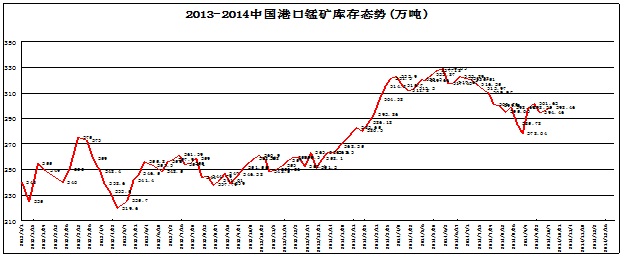 全球锰矿降价的趋势未见改观,行业集中度高的下行节奏必会蹒跚。笔者年初与一些国大矿山的销售人员开玩笑打过一杯竹叶青茶的赌,也在南宁会议明确表示南非锰矿将下降1美元/DMTU。然而,中国锰矿的进口量却再创新高,1-8月进口1086万吨,比2013年同期增长8.6%。港口库存高位徘徊,保税库等社会隐形库存居高不下,钦州等港口的现货价格再次跌落,价格倒挂彻底把贸易商再次逼向了绝境。