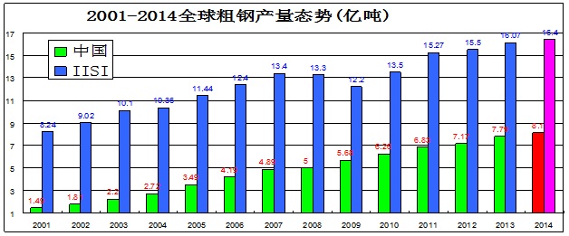 2013年,中国粗钢产量7.79亿吨,再创历史新高,占全球16.07亿吨的48.48%。2014上年,全球65个主要国家和地区的粗钢产量8.21亿吨,同比增长2.5%。同期,中国大陆粗钢产量6.929亿吨,同比增长4.5%。中国拉动全球粗钢产量增长的态势还在延续。