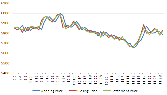 Opening price: 5800; Highest price: 5856; Lowest price: 5768; Closing price: 5828; Settlement price: 5818。