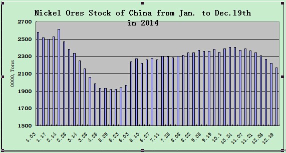 [Ferro-alloys.com]Since early Nov., the nickel ores stock of China continued to decline along with the active purchases and the decreasing imports. It was acknowledged that from Nov. to Mar. of next year, the nickel ores imports would not be large due to the rainy season of Philippines. Up to Dec.19th, total nickel ores stock of China was 21.7million tons, which fell by 2.2million tons in recent 6 weeks.