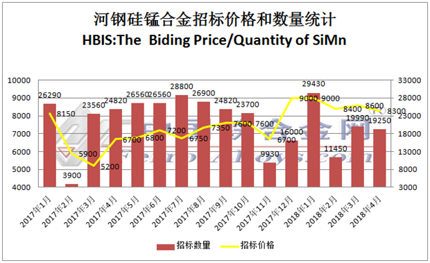 Spot market: Spot market: The price of silicon-manganese alloy continues to decline. It is predicted that the biding price of silicon manganese alloy will be about 8,000RMB/ton in May. Compared with the price last month it will be 300 RMB/ton declined. The price difference between steel plants in North and plants in South will be 100-200RMB/ton . The biding price of high carbon ferromanganese will be 7300RMB/ton which is declined 700RMB/ton compared with the price in April. The retail price is going to be much lower.