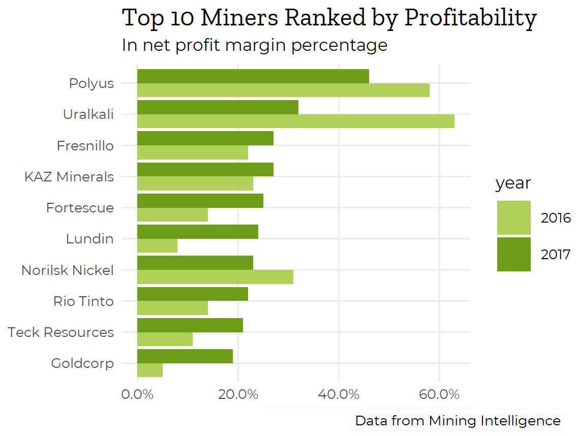 The following is the list of active mining companies compiled from data at Mining Intelligence that ranks by miners' net profit margins yielded in 2017 and measured in percentages. Companies that generate a majority of their revenues outside of mining/mineral processing operations have been excluded from this ranking. The research focus was on net income earned from ongoing operating activities and not from one-time sources of “accounting” income such as debt restructuring and impairment reversals. The threshold net income level for companies considered for this analysis was set at USD$400 million.