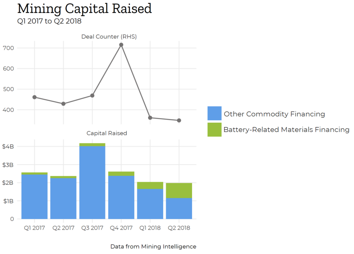 While most mineral commodities markets are in a decline and struggling, one particular sector is still thriving. With the continuing buzz around green energy, electric vehicles and battery technology, the capital raised in Q2 2018 through equity placements by companies focused on lithium, cobalt and other new world critical minerals hit a record level and exceeded US$800 million. This accounted for more than 40% of total mining capital raised during this period at major exchanges.