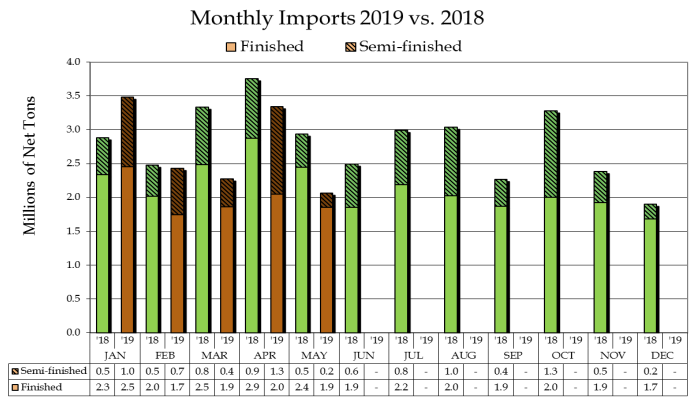 [Ferro-Alloys.com] Based on final Census Bureau data, the American Iron and Steel Institute (AISI) reported today that the U.S. imported a total of 2,062,000 net tons (NT) of steel in May 2019, including 1,853,000 net tons (NT) of finished steel (down 38.2% and 9.3%, respectively, vs. April final data). Through the first five months of 2019, total and finished steel imports are 13,584,000 and 9,953,000 net tons (NT), down 11.7% and 18.1%, respectively, vs. the same period in 2018. Annualized total and finished steel imports in 2019 would be 32.6 and 23.9 million NT, down 3.3% and 7.0%, respectively, vs. 2018. Finished steel import market share was an estimated 19% in May and is estimated at 21% over the first five months of 2019.