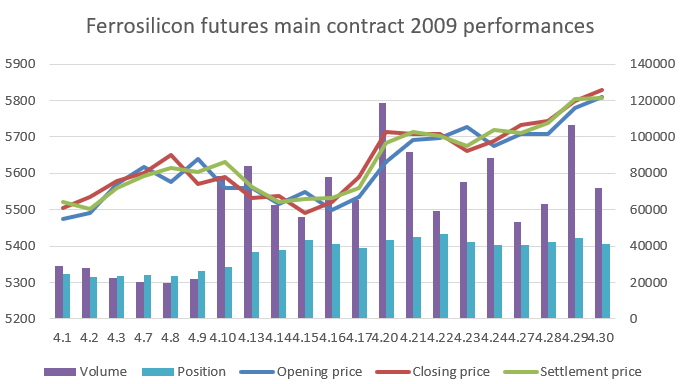 [Ferrosilicon Futures 2005 contract] Opening price of ferrosilicon futures 2005 contract of April was 5474, highest price was 5864, lowest price was 5452, closing price was 5830 and the settlement price was 5808. The positions were 41345 and the trading volumes were 1294992.