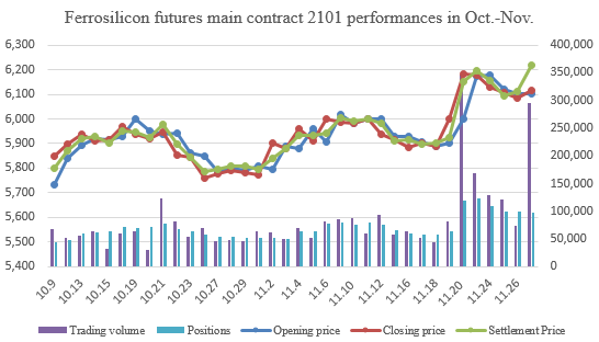 [Ferrosilicon Futures 2101 Contract] Opening price of ferrosilicon futures 2101 contract of this week was 6,172, highest price was 6,320, lowest price was 6,050, closing price was 6,116 and the settlement price was 6,216. The trading volumes were 787,969 and the positions were 98,165.