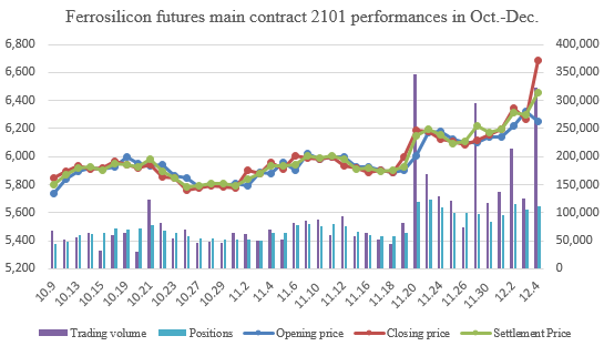 [Ferrosilicon Futures 2101 Contract] Opening price of ferrosilicon futures 2101 contract of this week was 6,138, highest price was 6,682, lowest price was 6,110, closing price was 6,682 and the settlement price was 6,458. The trading volumes were 918,400 and the positions were 110,698.