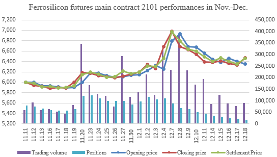 [Ferrosilicon Futures 2101 Contract] Opening price of ferrosilicon futures 2101 contract of this week was 6,440, highest price was 6,566, lowest price was 6,308, closing price was 6,472 and the settlement price was 6,464. The trading volumes were 467,900 and the positions were 17,455.