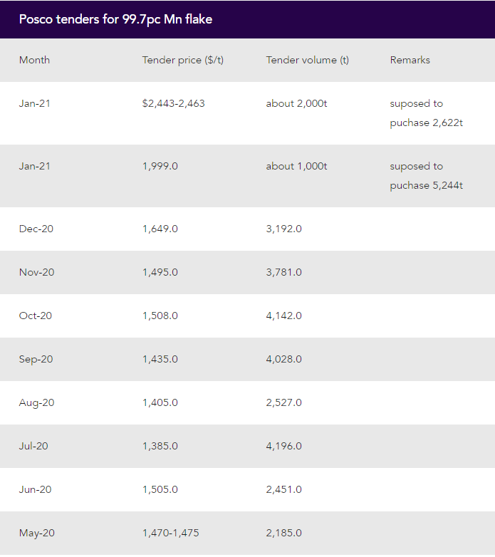 Posco's tender price for around 2,000t manganese flake yesterday rose to $2,443-2,463/t cif South Korean ports for January delivery, up from $1,999/t from a tender it issued in the middle of December.