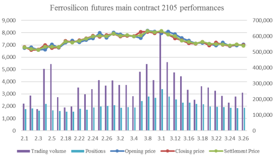 [Ferrosilicon Futures 2105 Contract] Opening price of ferrosilicon futures 2105 contract of this week was 6956, highest price was 7218, lowest price was 6802, closing price was 6978 and the settlement price was 6948. The trading volumes were 1108776 and the positions were 144672.