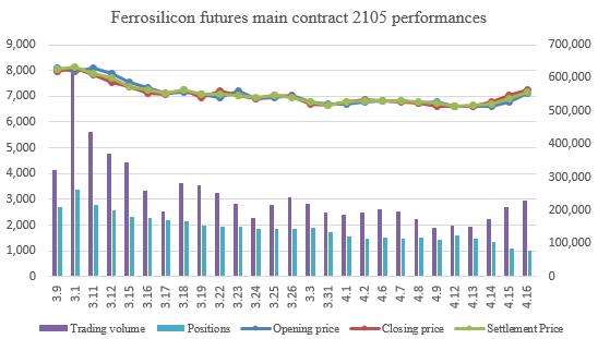 [Ferrosilicon Futures 2105 Contract] Opening price of ferrosilicon futures 2105 contract of this week was 6,620, highest price was 7,328, lowest price was 6,540, closing price was 7,258 and the settlement price was 7,144. The trading volumes were 917,041 and the positions were 77,789.