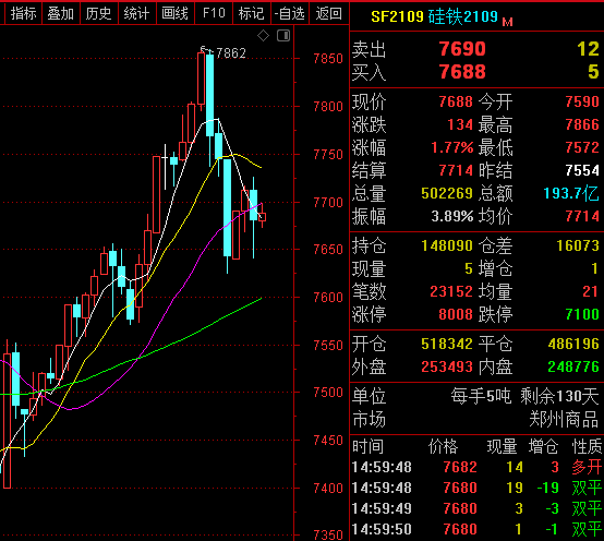 [Ferrosilicon Futures 2105 Contract] Opening price of ferrosilicon futures 2109 contract of this week was 7,400, highest price was 7,866, lowest price was 7,400, closing price was 7,688 and the settlement price was 7,714. The trading volumes were 823,112 and the positions were 148,090.