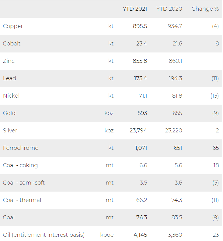 Own sourced zinc production of 855,800 tonnes was in line with the comparable 2020 period. Recovery from 2020 Covid restrictions was offset by temporarily lower Kazzinc production pending the ramp-up of the recently commissioned Zhairem mine.