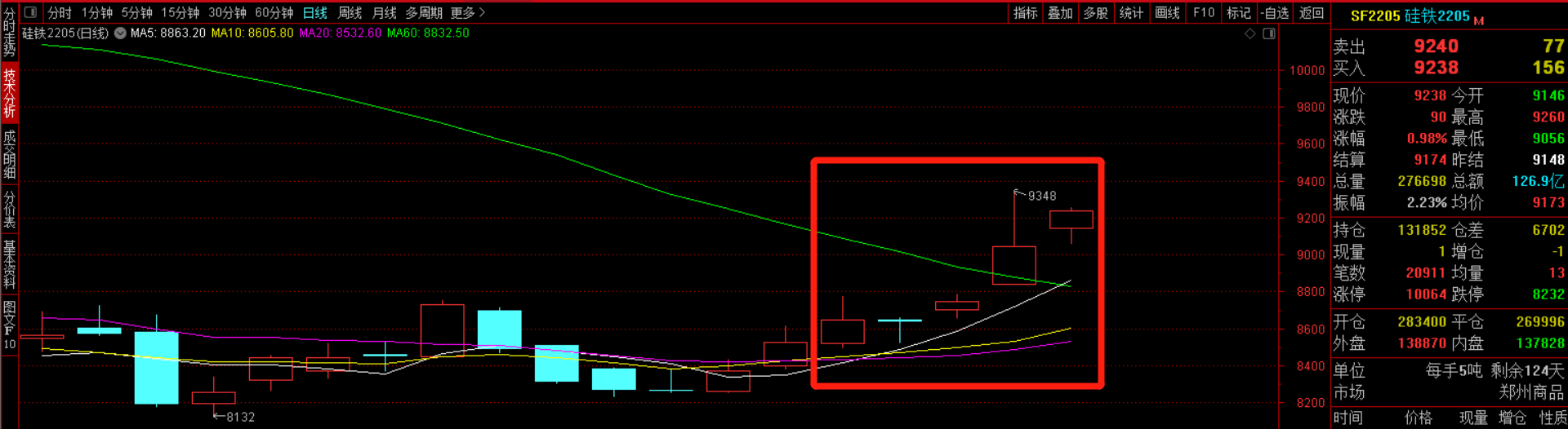 The opening price of 2205 main contract of ferrosilicon futures this week was 8,520, the highest price was 9,348, the lowest price was 8,492, the closing price was 9,238, the settlement price was 9,174, the trading volume was 1,338,661, and the position was 131,852, a decrease of 8.84%.