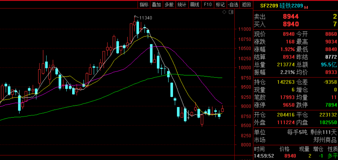 The weekly opening price of 2209 main contract was 8,920, the highest price was 9,034, the lowest price was 8,666, the closing price was 8,940, the settlement price was 8,934, the trading volume was 939,866, and the position was 142,263, up 1.22%.