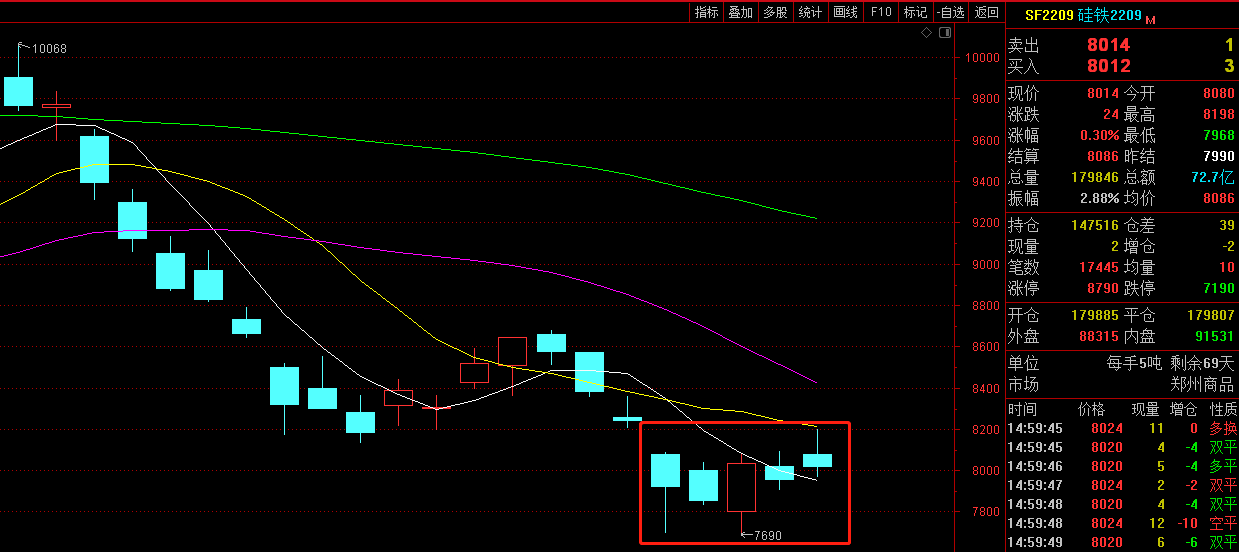 The weekly opening price of 2209 main contract was 8080, the highest price was 8198, the lowest price was 7690, the closing price was 8014, the settlement price was 8086, the trading volume was 974643, and the position was 147516, down 4.84%.
