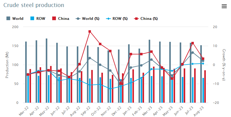 【Ferro-alloys.com】:World crude steel production for the 63 countries reporting to the World Steel Association (worldsteel) was 152.6 million tonnes (Mt) in August 2023, a 2.2% increase compared to August 2022.