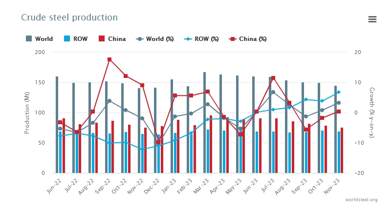 Ferro-alloys.com: World crude steel production for the 71 countries reporting to the World Steel Association (worldsteel) was 145.5 million tonnes (Mt) in November 2023, a 3.3% increase compared to November 2022.