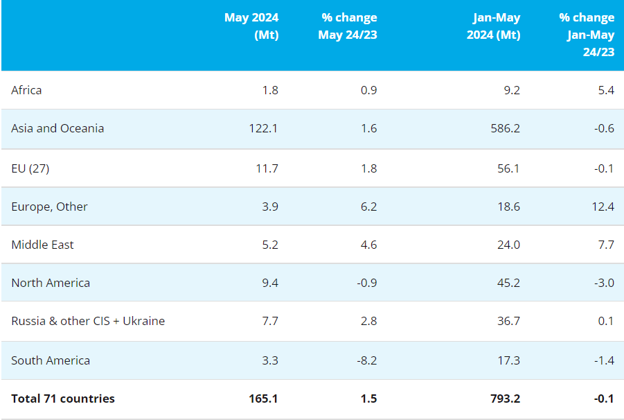 Africa produced 1.8 Mt in May 2024, up 0.9% on May 2023. Asia and Oceania produced 122.1 Mt, up 1.6%. The EU (27) produced 11.7 Mt, up 1.8%. Europe, Other produced 3.9 Mt, up 6.2%. The Middle East produced 5.2 Mt, up 4.6%. North America produced 9.4 Mt, down 0.9%. Russia & other CIS + Ukraine produced 7.7 Mt, up 2.8%. South America produced 3.3 Mt, down 8.2%.
