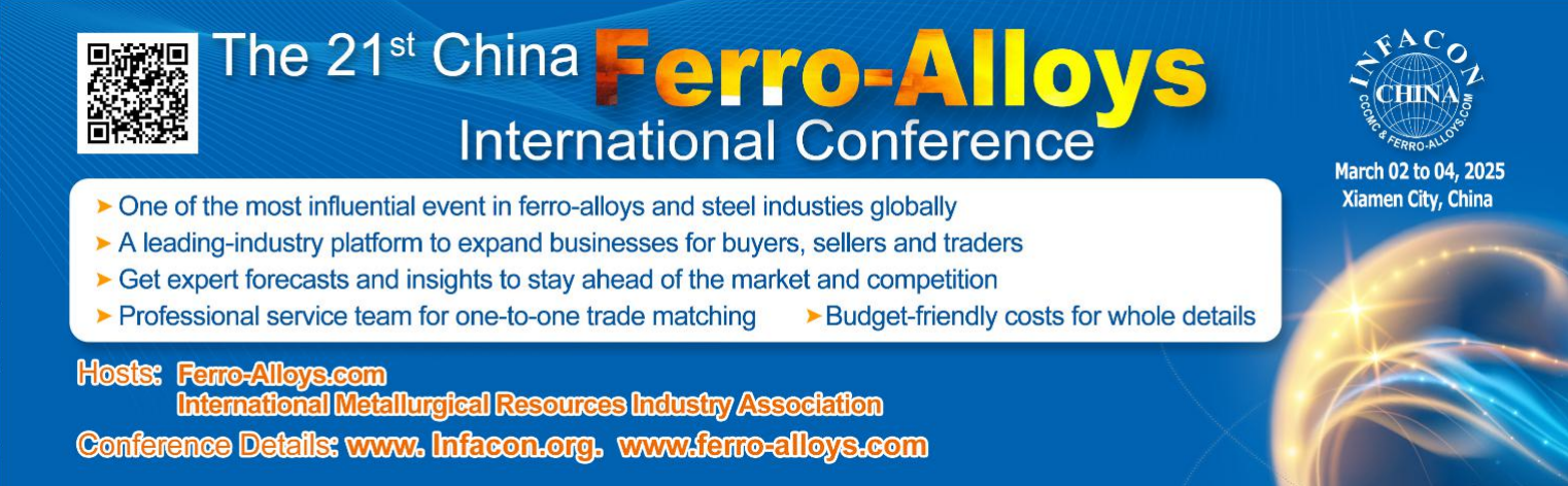 The 21st China Ferro-Alloys International Conference, hosted by Ferro-Alloys.com and International Metallurgical Resources Industry Association, will be held on March 2-4, 2025 in Xiamen City of SE China. We sincerely invite you to participate this unique event to expand your business. Please email to annkang@ferro-alloys.com if you are interested in any information.