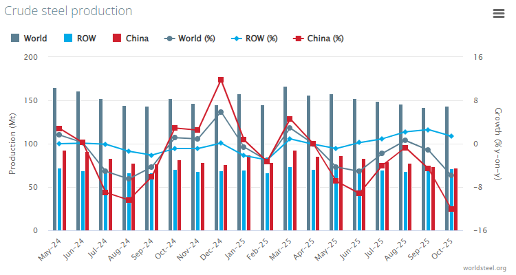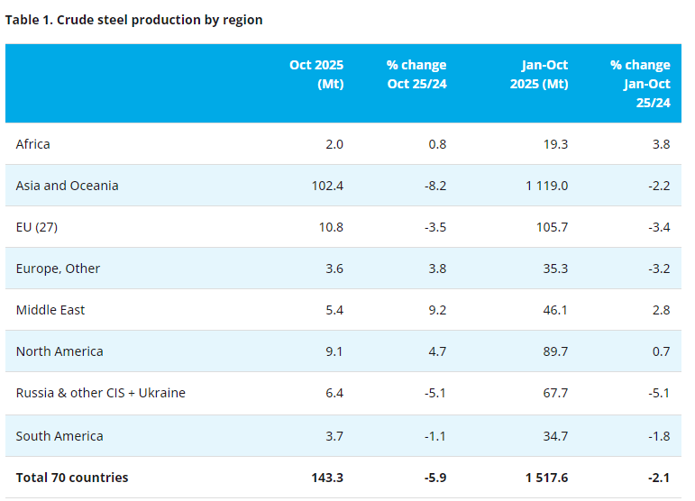 [Fellow]World crude steel production for the 70 countries reporting to the World Steel Association (worldsteel) was 143.3 million tonnes (Mt) in October 2025