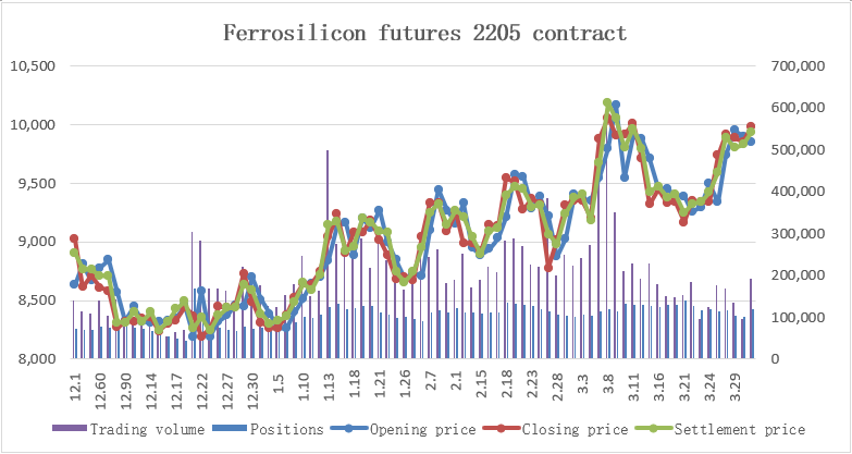 The 2205 ferrosilicon contract price on ZCE closed at 9984 yuan per ton on March 31. |