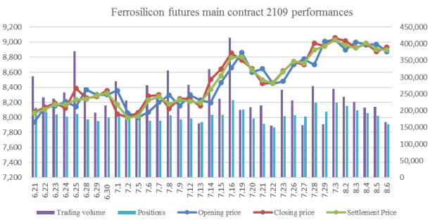 The 2109 ferrosilicon contract price on ZCE closed at 8,904 yuan per ton on August 9. |