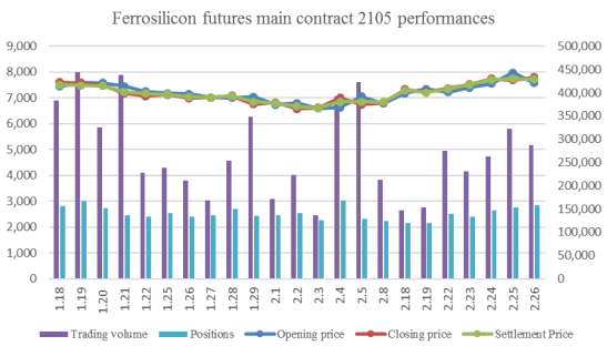 The 2105 ferrosilicon contract price on ZCE closed at 7,920 yuan per ton on March 1. |