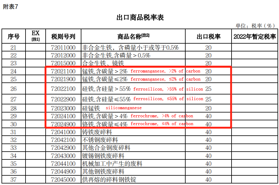 This is the details of China ferroalloys customs export and import tariff in 2022,and enforced from January 1st, 2022.