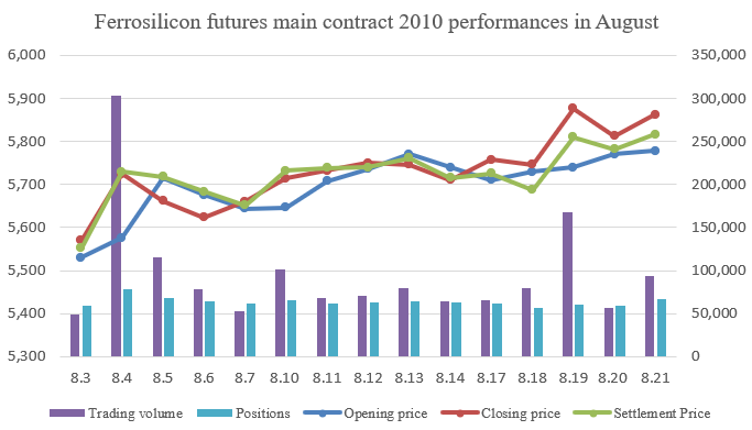 The 2010 ferrosilicon contract price on ZCE closed at 5824 yuan per ton on August 21. |