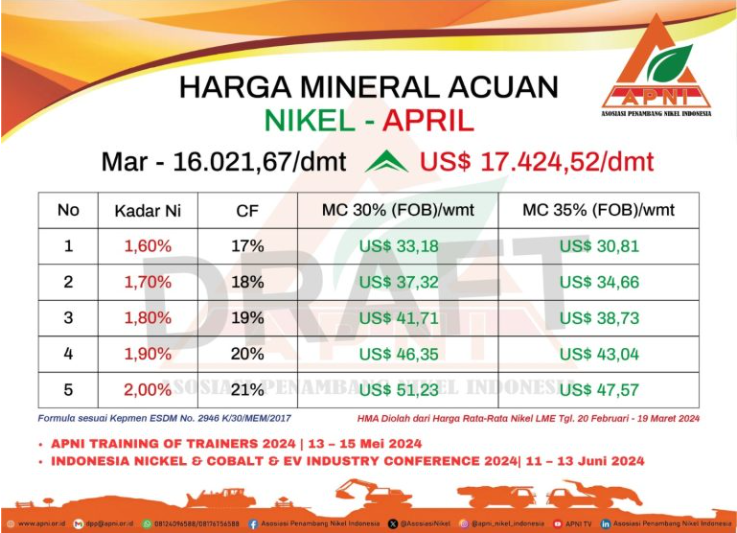 |  | The Indonesian nickel miner association (APNI) has just released the Mineral price (HMA) of high nickel ore and of lower nickel ore for April 2024. |