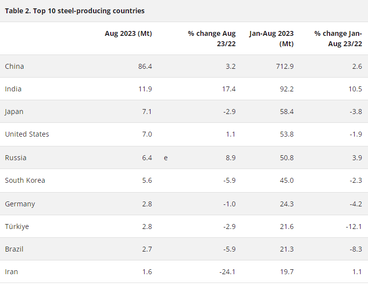 worldsteel: August 2023 crude steel production increase 2.2% YoY